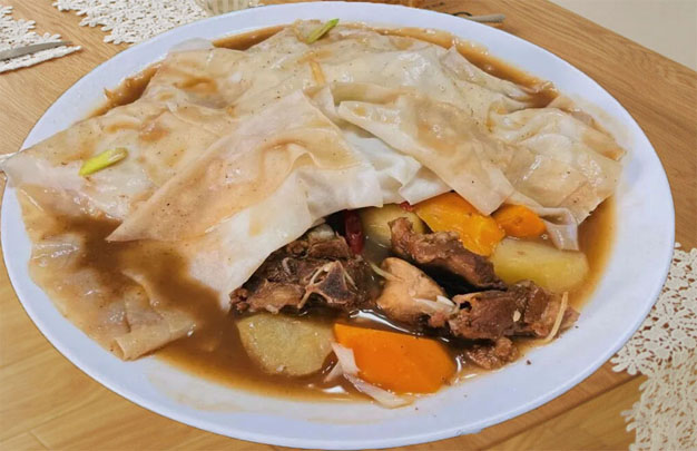 羊肉焖饼是一道具有200多年历史的新疆传统菜肴,主要流行于哈密、昌吉东四县、木垒、奇台、吉木萨尔及甘肃河西走廊地区。它不仅是当地汉族招待客人的高档菜品,更在2018年被评为“中国菜”之新疆十大经典名菜之一。该菜又被称为“绵羊盖被”,形象地描述了薄饼覆盖在羊肉上的烹饪方式。