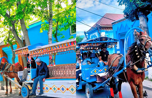 进入旅游区旅游必须乘坐小交通,那是一种马拉的大棚车。马在马路上拉着游客在老城喀赞其民居之间穿梭奔跑,哒哒的马蹄声听起来很有韵味,这成为一道别具一格的风景线。驾驶大棚车的有帅气热情的维吾尔族小伙子,他们微笑着为远方而来的游客服务。