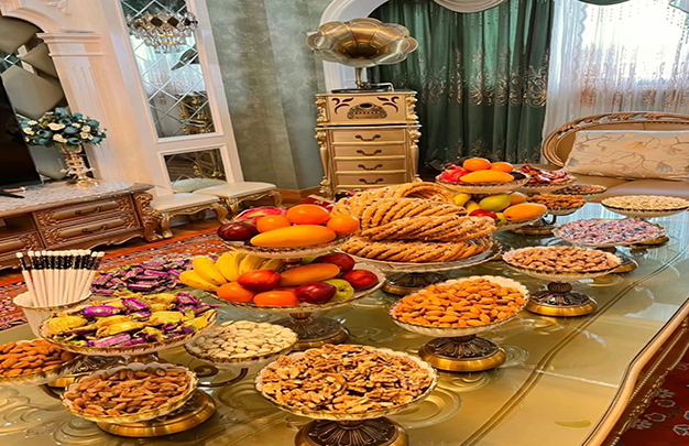 节日期间,餐桌上摆满了用精美的器皿装得满满的各种零食,有馓子、巴旦木、无花果、核桃、开心果、蜜枣、葡萄干、腰果、西梅干、巴哈利、馕等;还有各类水果,如西瓜、哈密瓜、桃子、香蕉、葡萄等,应有尽有,甜度直接拉满。