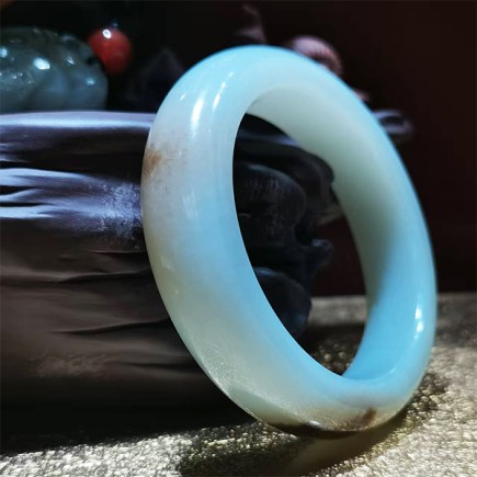 和田玉粉青黑皮俏色籽料手镯,色泽粉青,玉质油润,脂份细腻,天然黑皮俏色。圈口56mm,条款1.5cm.