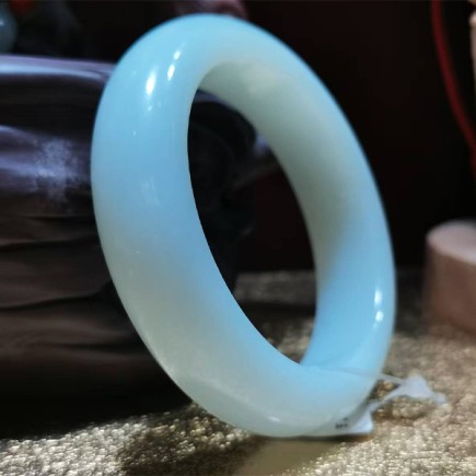 和田羊脂玉天然蓝光手镯,圈口56mm,条款1.8cm,玉质油润,天然蓝色光泽。