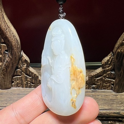 和田俏色白玉观音,天然俏色皮,玉质非常细腻油润,籽形完美无暇。