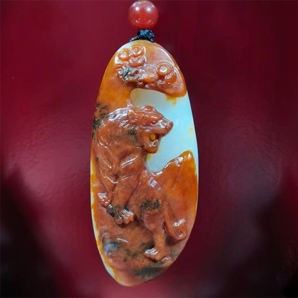 和田玉虎虎生威挂件,天然红皮籽料挂件,红油皮白肉,利用皮色巧雕刻。