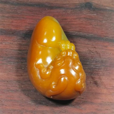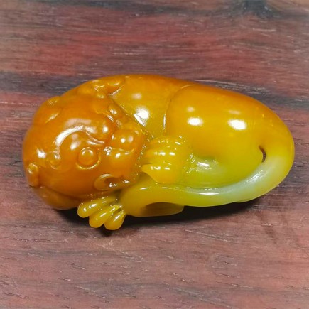 貔貅头部、背部颜色深黄,肚子颜色由浅黄至白色,颜色过度自然,好似天成,将貔貅的威猛与灵动刻