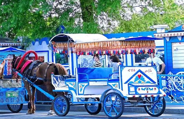 进入旅游区旅游必须乘坐小交通,那是一种马拉的大棚车。马在马路上拉着游客在老城喀赞其民居之间穿梭奔跑,哒哒的马蹄声听起来很有韵味,这成为一道别具一格的风景线。驾驶大棚车的有帅气热情的维吾尔族小伙子,他们微笑着为远方而来的游客服务。