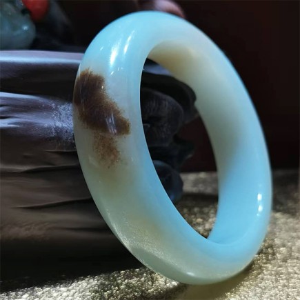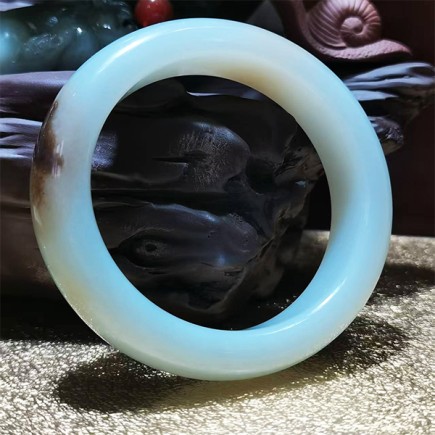 和田玉粉青黑皮俏色籽料手镯,色泽粉青,玉质油润,脂份细腻,天然黑皮俏色。圈口56mm,条款1.5cm.