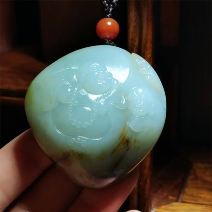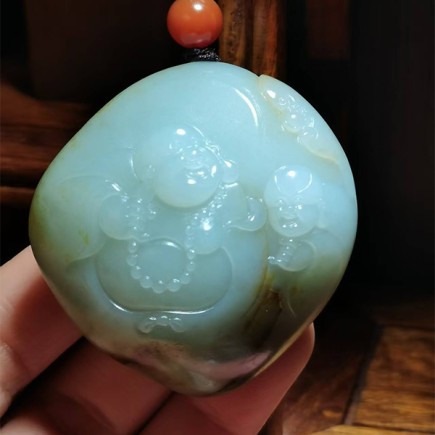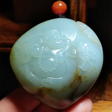 新疆和田籽料佛挂件,天然和田玉籽料苏工雕刻,天然褐色皮,天然籽料毛孔,玉质细腻油润。