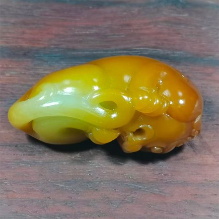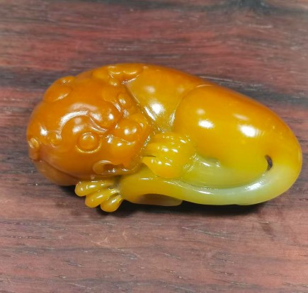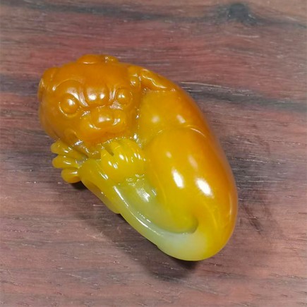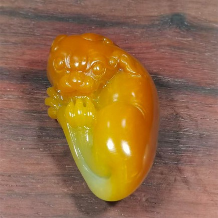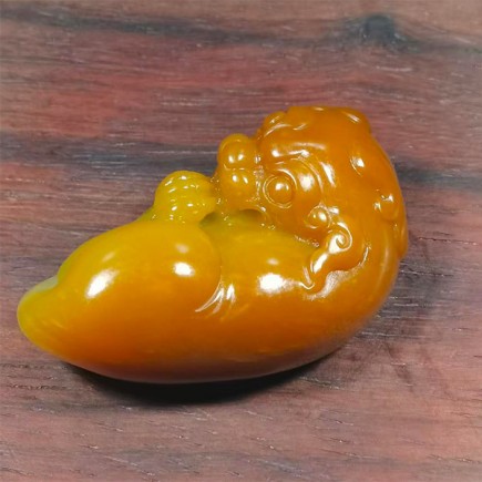 貔貅头部、背部颜色深黄,肚子颜色由浅黄至白色,颜色过度自然,好似天成,将貔貅的威猛与灵动刻
